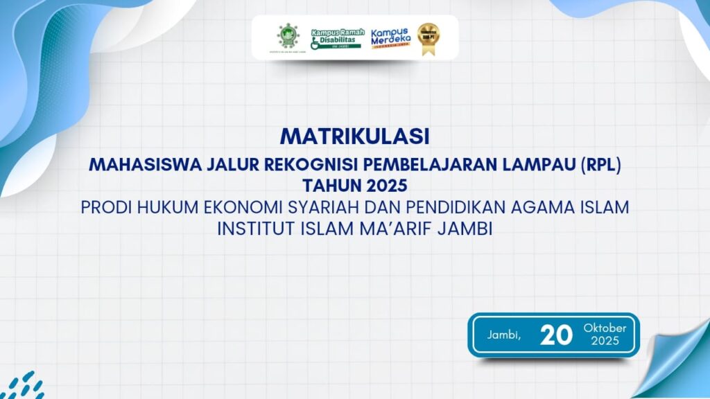 Jambi, 18 Oktober 2025 – Institut Islam Ma’arif (IIM) Jambi sukses melaksanakan kegiatan Matrikulasi Mahasiswa Jalur Rekognisi Pembelajaran Lampau (RPL) bagi Program Studi Hukum Ekonomi Syariah (HES) dan Pendidikan Agama Islam (PAI). Kegiatan ini diikuti oleh 50 orang mahasiswa RPL yang berasal dari berbagai instansi dan latar belakang profesi.