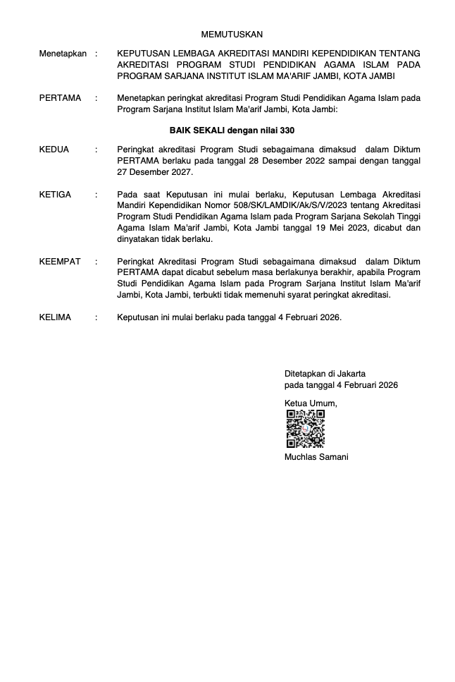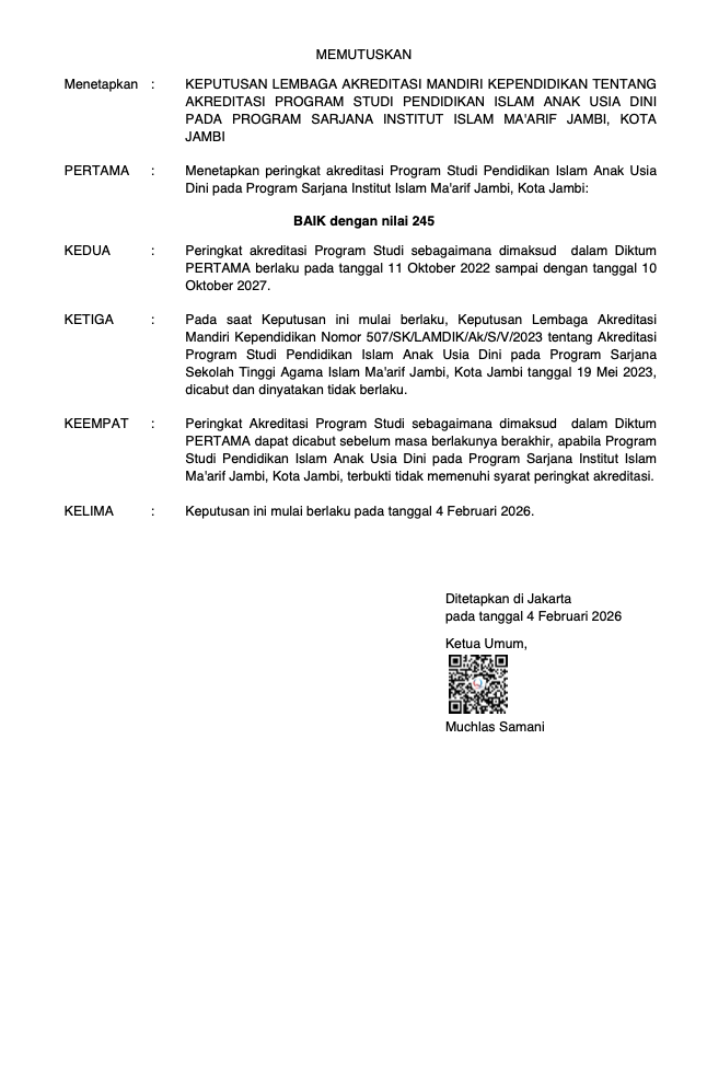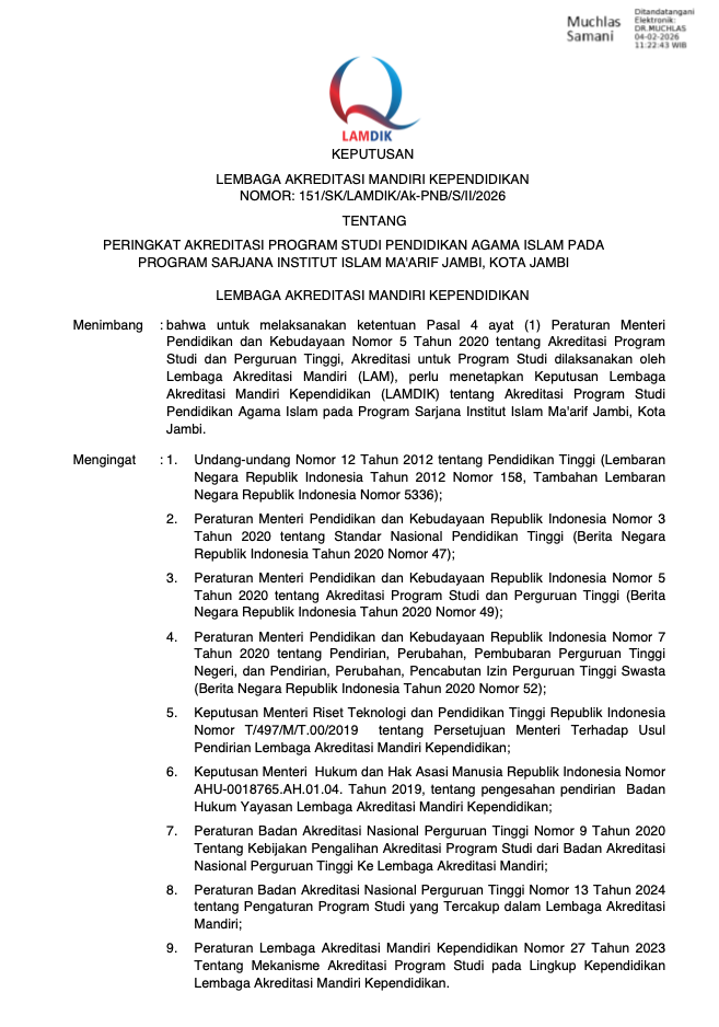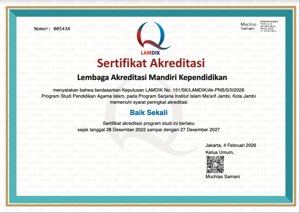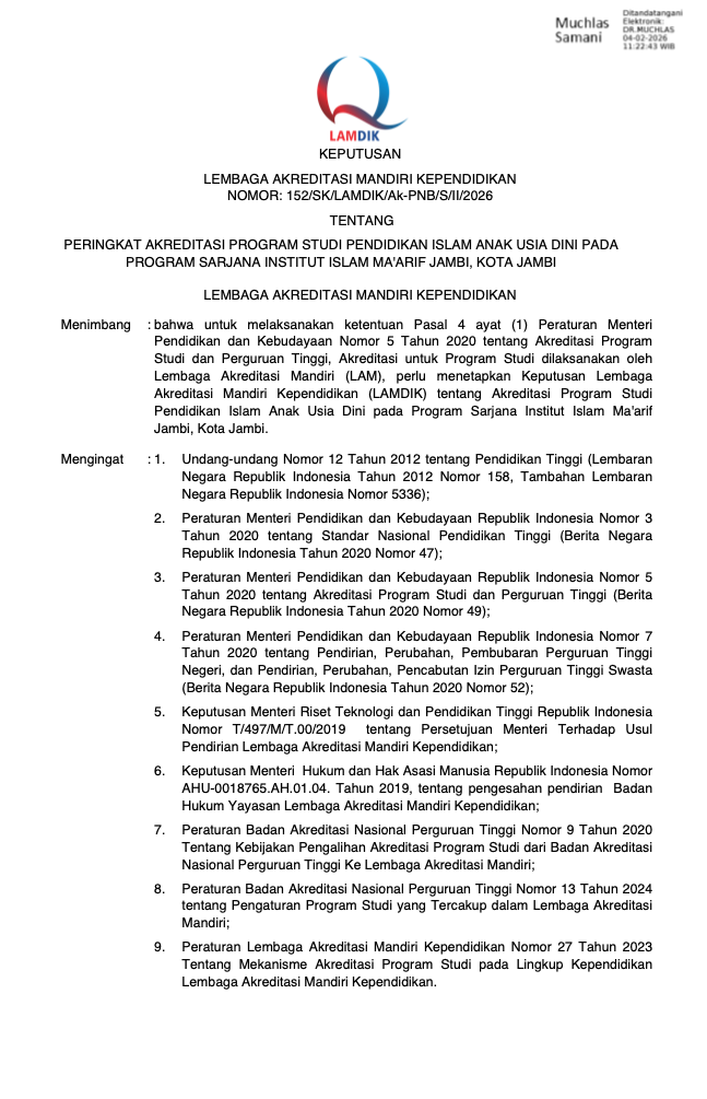 Download Pengumuman SK dan Sertifikat Akreditasi LAMDIK Program Studi Pendidikan Agama Islam (PAI) dan Pendidikan Islam Anak Usia Dini (PIAUD) February 5, 2026February 5, 2026 admin 0 Comments